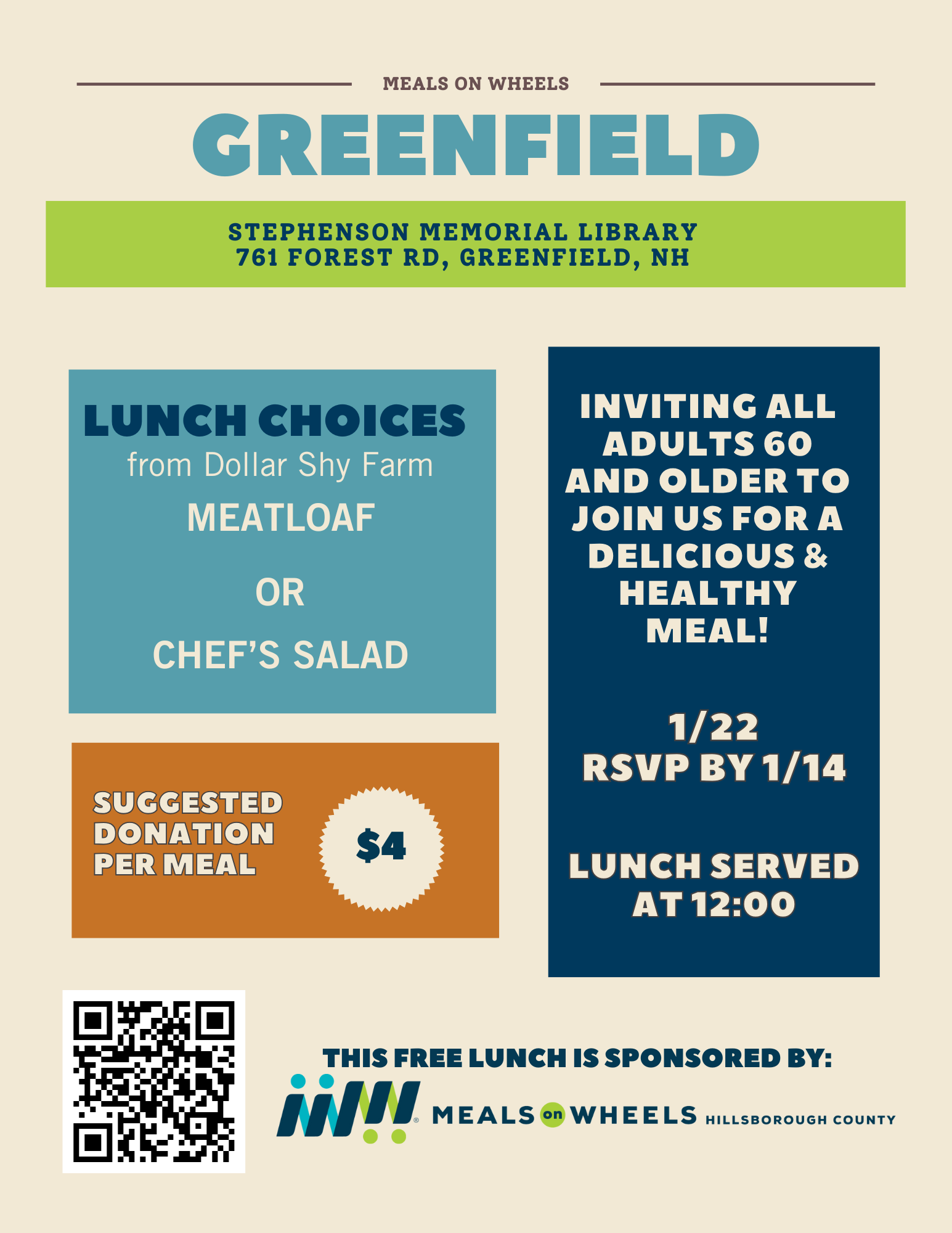 Location: Stephenshon Memorial Library 761 Forest RD, Greenfield, NHDate: Fourth Thursday of every monthLunch Served: 12:00 PM