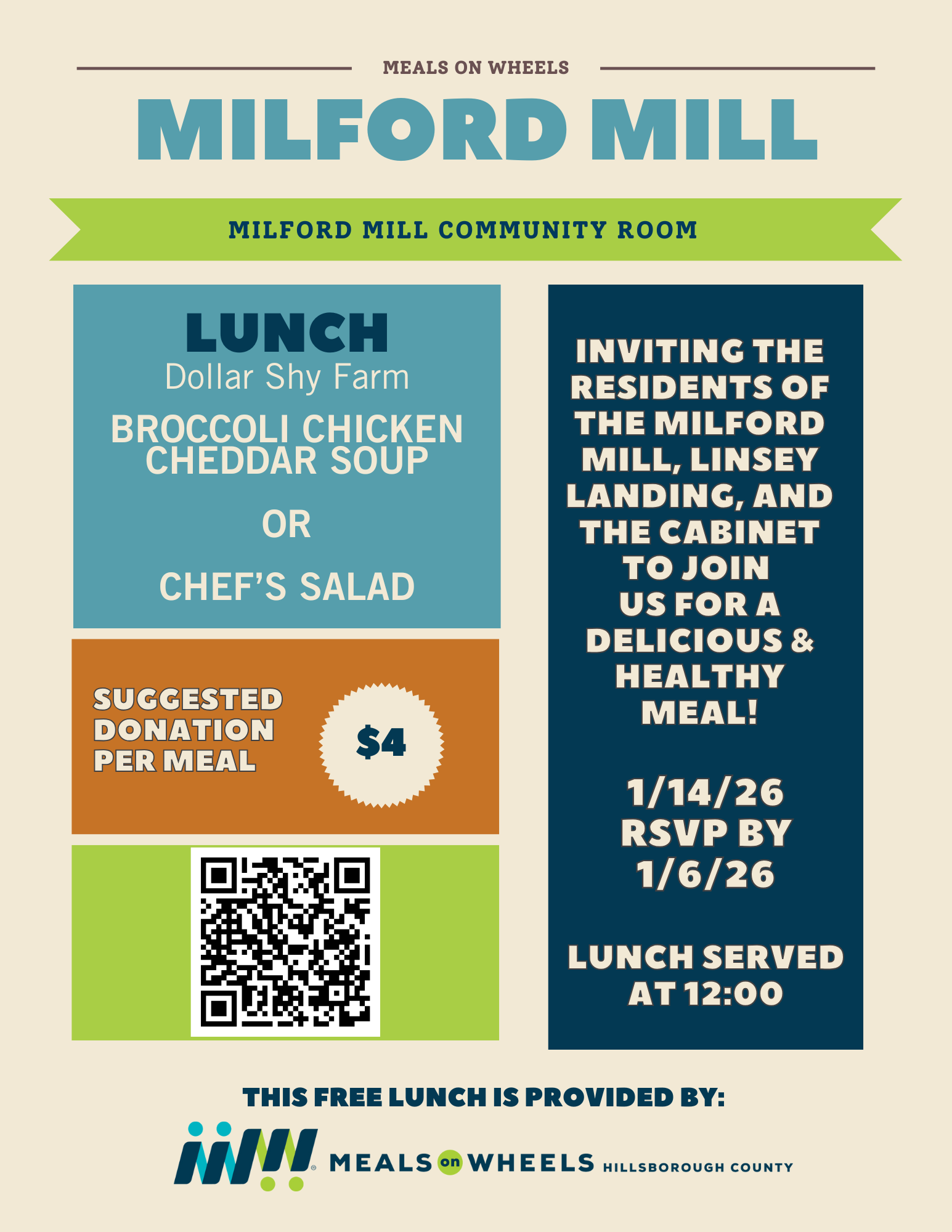 $4 per meal Your contribution helps us continue to provide healthy meals and friendly connections for older adults in our community.